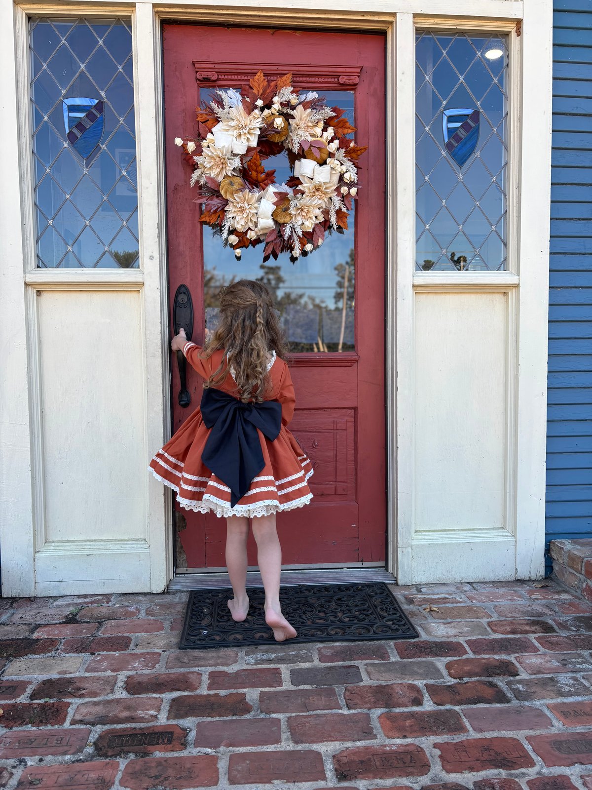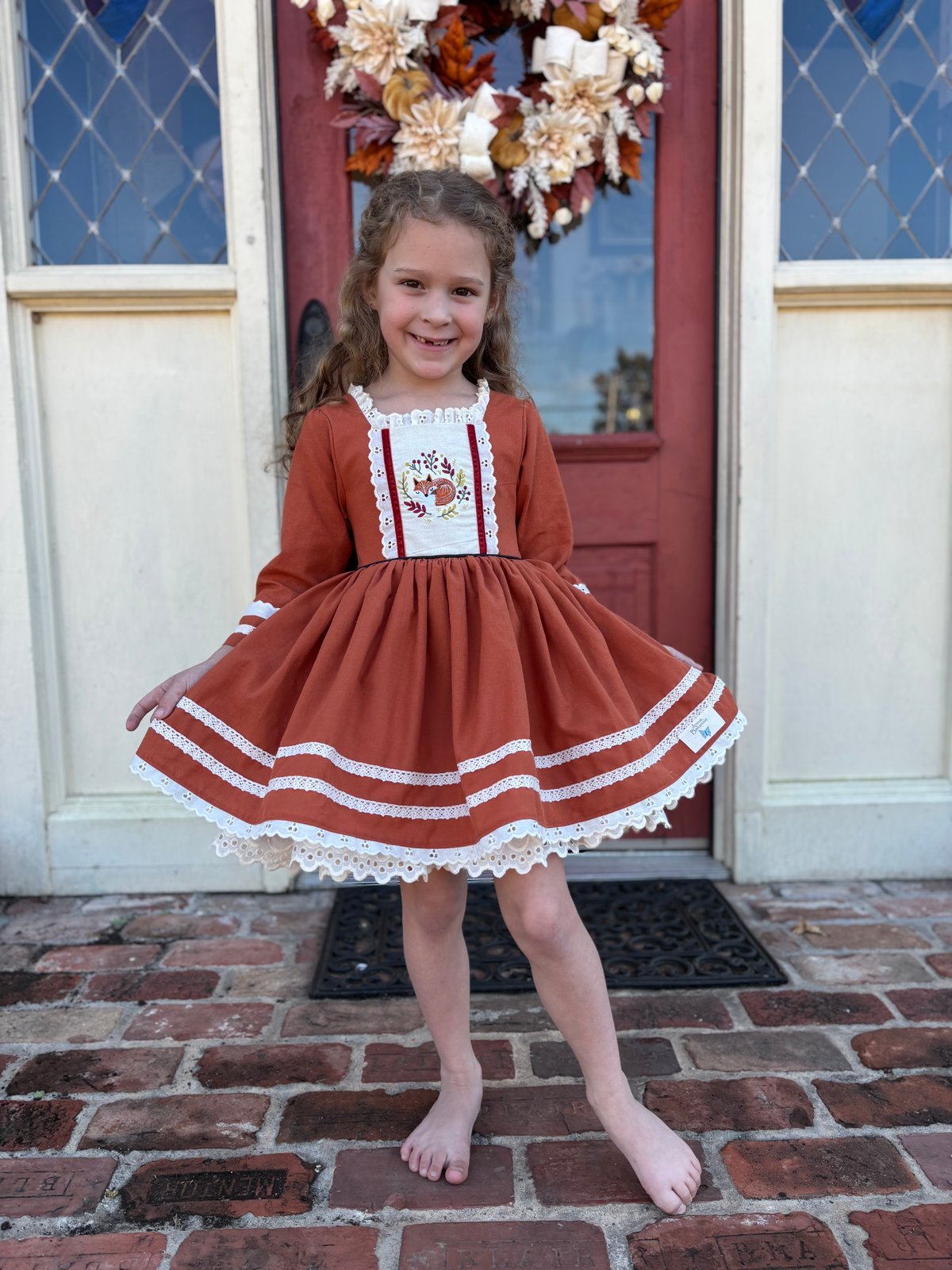 Dress is made from 100% Cotton with machine embroidery and velvet ribbon detail on the bodice.